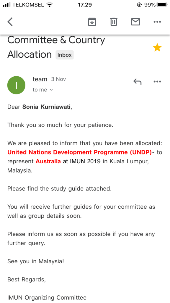 Firstly, I want you guys to know in the UN, they have many councils. But, in IMUN, we have World Trade Organization (WTO), World Health Organization (WHO), United Nations Security Council (UNSC), International Court of Justice (ICJ), United Nations High Commission for Refugees (UNHCF). [tbh, I GOT GOOSEBUMPS WHILE WRITING THOSE COUNCIL] I chose UN Development Programme (UNDP). Do not ask me how nervous I am, extremely. I really have no idea guys what I was going truly to say. T_T (Tips: you should do research as much as you can) thankfully, my chair explained very details of what we should do in the committee session. Each committee is presided over by a Chairperson (or Chair), whose role it is to keep the debate running. Most of us were first-timer, so our chair explained very details. So, in the UN, basically, they have two delegates to represent their country. But, in IMUN this time, they only have one delegate to represent their country. A delegate is a person sent or authorized to represent others, in particular, an elected representative sent to a conference (Oxford dictionary). Remember this is UN simulations, so we have to pretend like representing our country at the UN conference. Although I chose Indonesia and Switzerland, I got Australia to represent off. So, we started our first committee. In UNDP, there were two topics that we should discuss: Ensuring Proper Waste Management in South Asia and Attaining Equal Access to Education & Health Services in Rural Area. Before starting, the chair would like to have a roll call by voting first whether we present and voting or just present> {I will be explaining this in the next story about “MUN”}. We asked by the chair to choose which topic that should be discussed first. We chose first topic by voting and raising placard either against or favor. But, all delegates in favor chose first topic to be discussed first. After choosing the topic, delegates will be asked by the chair to raise motion. Motion is a specific action made by delegates to direct debate in a certain direction. There are many motions in MUN, again>{I will be explaining this in the next story about “MUN”}. After that, the chair asked all of us if we want to be part of general list> {I will be explaining this in the next story about “MUN”}. People might say General Speaking List (GSL) is a very chance for those to represent their country, and GSL is LIMITED. Then, we entered a session called “formal debate” or moderated caucus. Here we were talking about the motion which has raised by other delegate before. Then, we did argue about the solution for South Asia and so on. Unfortunately, time was up, so we have to continue next morning. I went home by bus with my buddies.